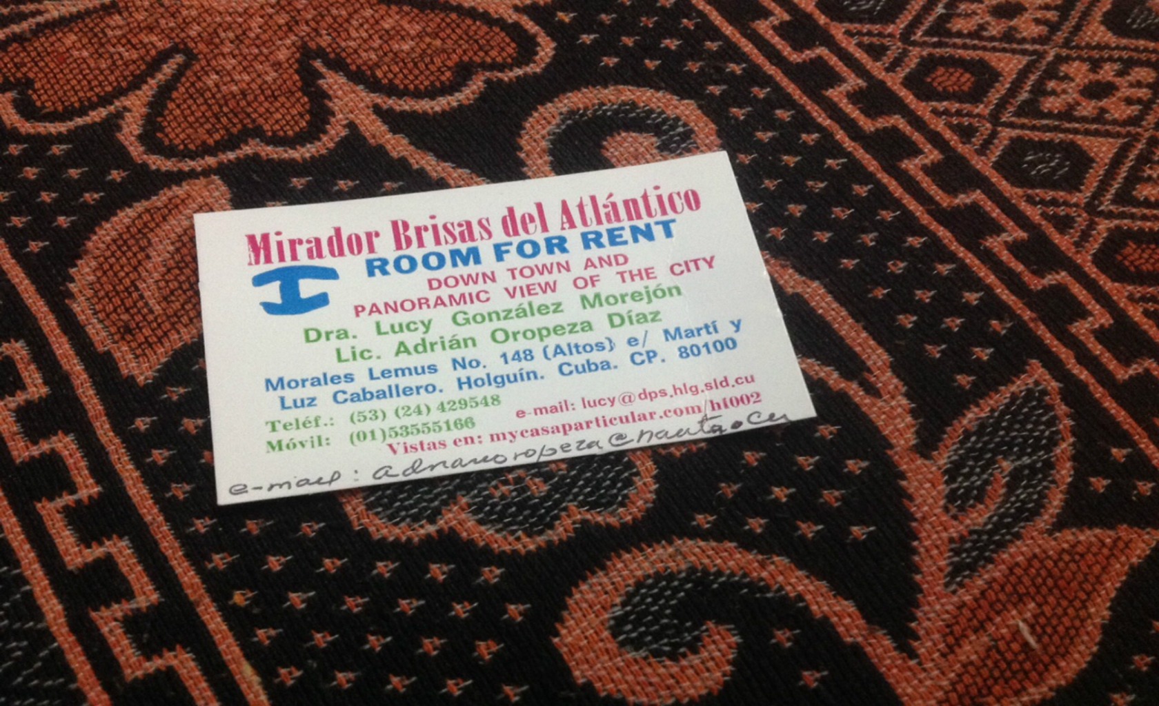 Je vous recommande la casa Mirador Brisas del Atlantico. Voici une famille très chaleureuse et conviviale, cultivée et de bonne éducation. La maison est située en plein centre de Holguin, à côté de la Casa de la Musica. Pour le prix de 20cuc la nuit, et 3cuc par personne pour un déjeuner si copieux qu’il vous cale pour la journée, vous aurez droit à une chambre intime fraîche bien ventilée, air conditionné si nécessaire, avec petit réfrigérateur et boissons, télévision et musiques ainsi que lecture, avec ses jolies boiseries d’époque, sa salle de bain irréprochable, et le clou, après avoir gravi les escaliers de la grande bâtisse où sont réunies plusieurs générations aux différents niveaux, vous aurez la surprise de découvrir Holguin à 360° sur une terrasse bien gardée par de jolies grilles en fer forgé. Un moment délicieux, inoubliable, d’ailleurs vous devrez signer le livre d’or rempli de commentaires élogieux de clients devenus des amis fidèles….comme moi !