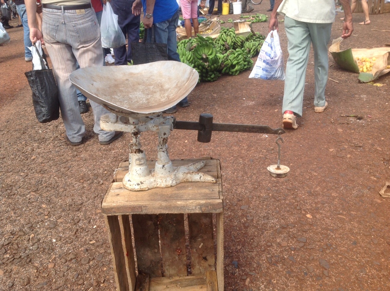 bananes, poires cubaines, citrons verts, ananas, une balance cubaine et goyaves dans des corbeilles faites avec des feuilles de bananier.
