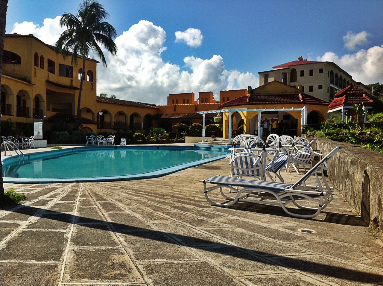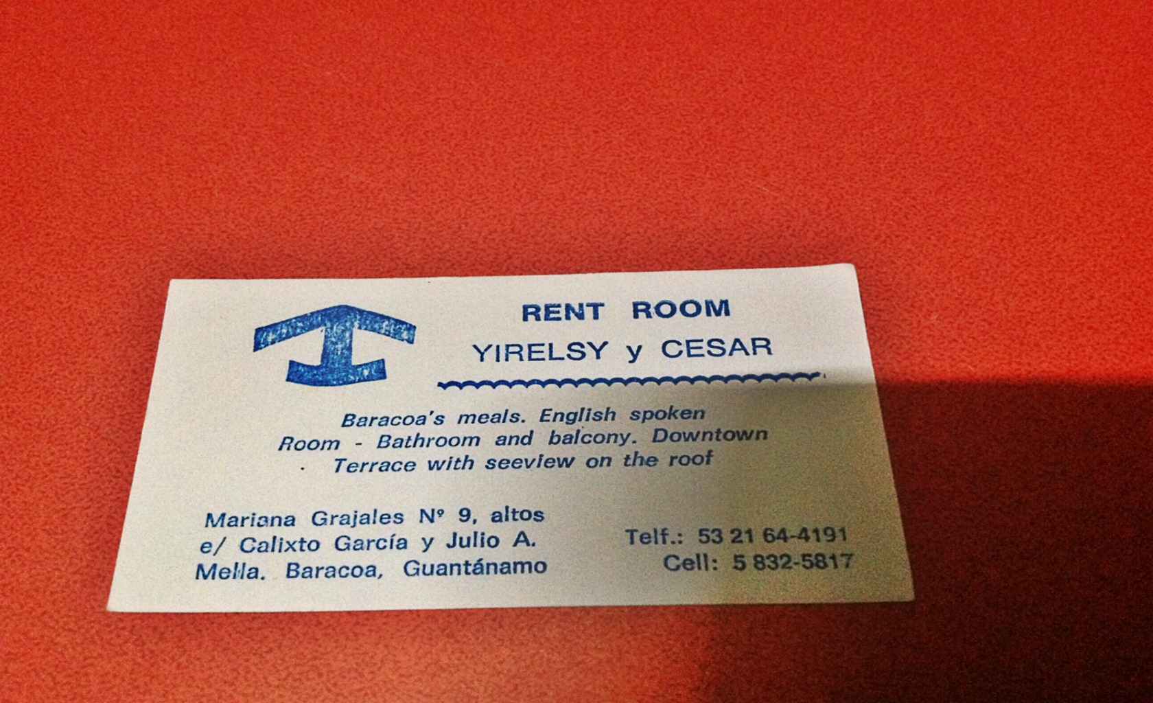 De la terrasse, elle dispose d’une jolie vue sur la mer aux relents d’algues fraîches, en face du parc où jouent encore quelques enfants. Puis sur la gauche, j’aperçois le Mont Yunque légèrement embrumé par la nuit qui s’annonce ainsi que l’hôtel jaune « Le Castillo » juché tout en haut et que je me promets d’aller voir au plus vite. La chambre simple et sa douche très propre seront mon point de chute pendant mon séjour à Baracoa.