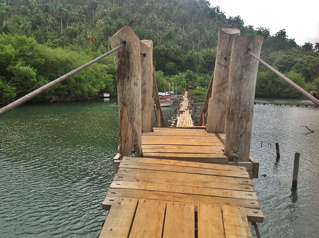 Le pont est branlant et donne un peu d’adrénaline quand on croise quelqu’un, mais la traversée laisse découvrir des petits hangars à bateaux, aux toits de palme, et quelques jolies barques très colorées.