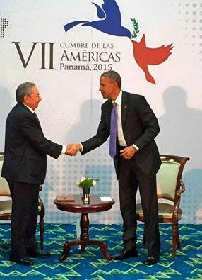 Rencontre entre Raul Castro et Barack Obama lors du septième Sommet des Amériques, au Panama, le 11 avril 2015
