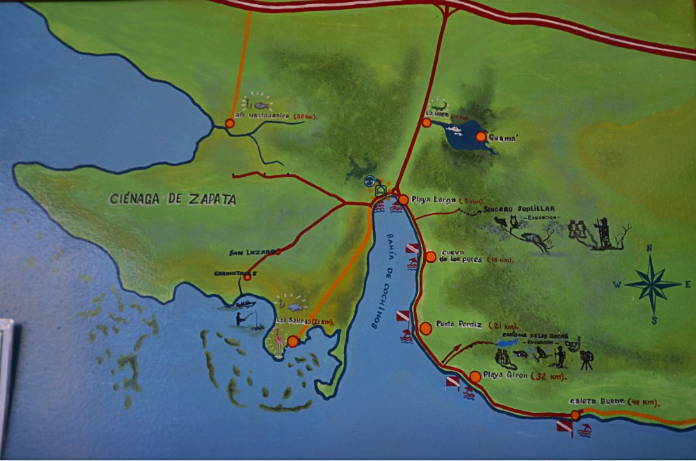 On parle également parfois de « la baie des cochons » pour désigner la zone de Playa Giron. Ce n’est pas une allusion aux mercenaires anti-castristes qui débarquèrent ici en 1961 pour tenter de renverser le régime, mais simplement une référence à l’élevage porcin qui représenta une activité économique importante à la fin du 17ème siècle ;-).