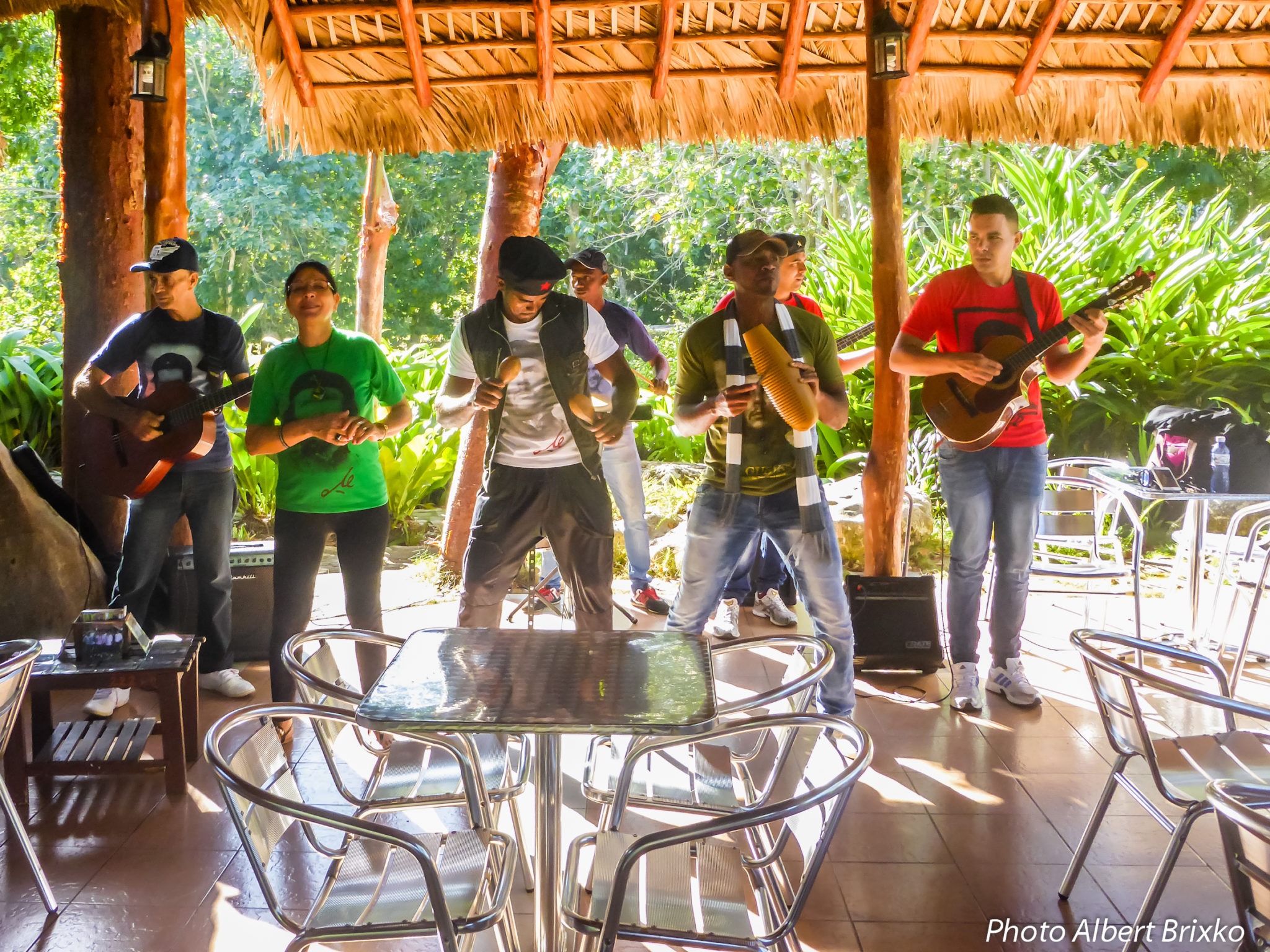 Une excellente surprise nous attend en cours de route… Un quart d’heure d’arrêt improvisé à l’ « écovillage » de Las Terrazas. Ce sera suffisant pour nous permettre d’apprécier la beauté et la quiétude du lieu. Nous y sommes accueillis par un groupe d’excellents musiciens, manifestement fans du « Ché », si l’on en juge par leurs t-shirts !