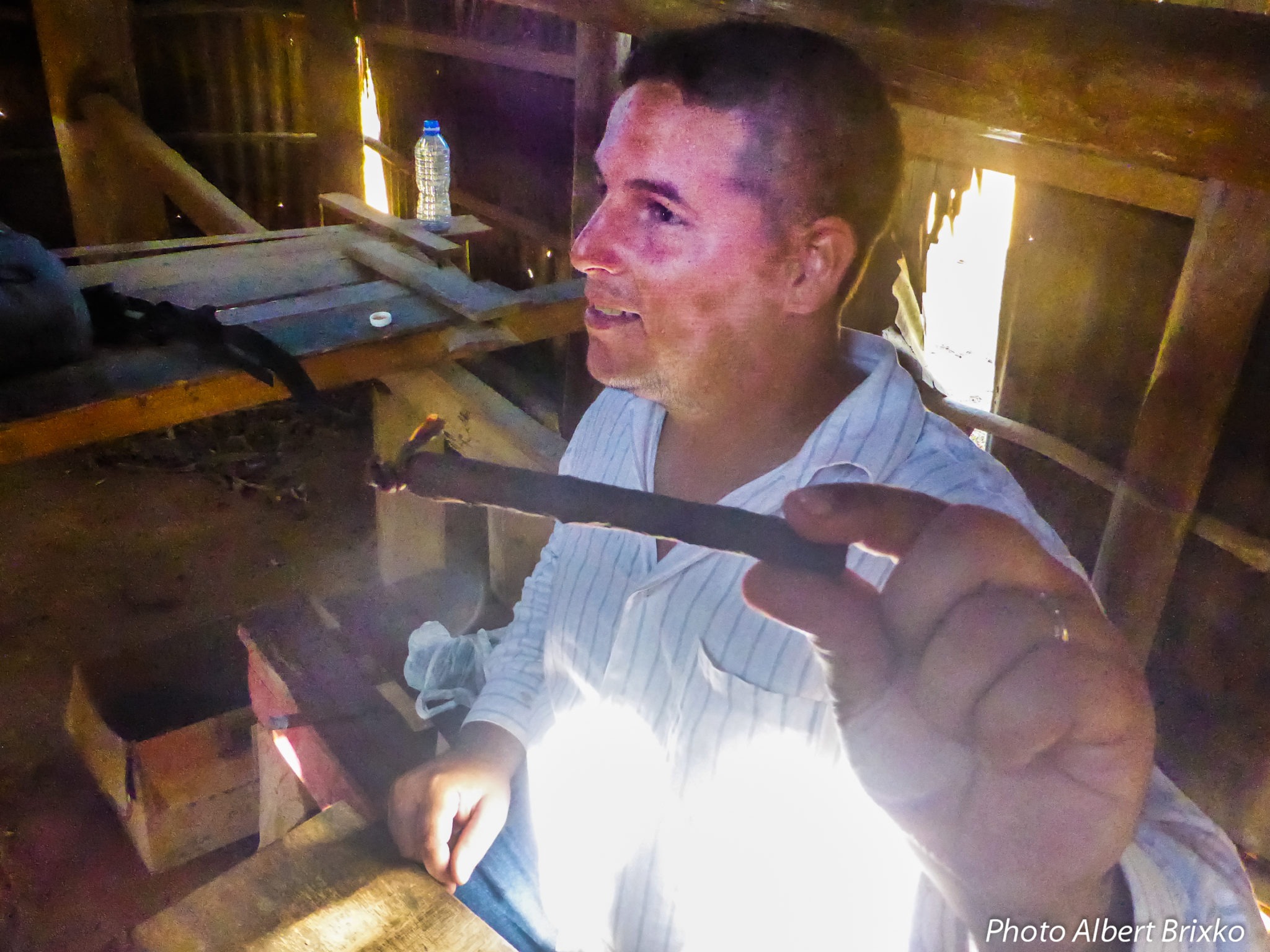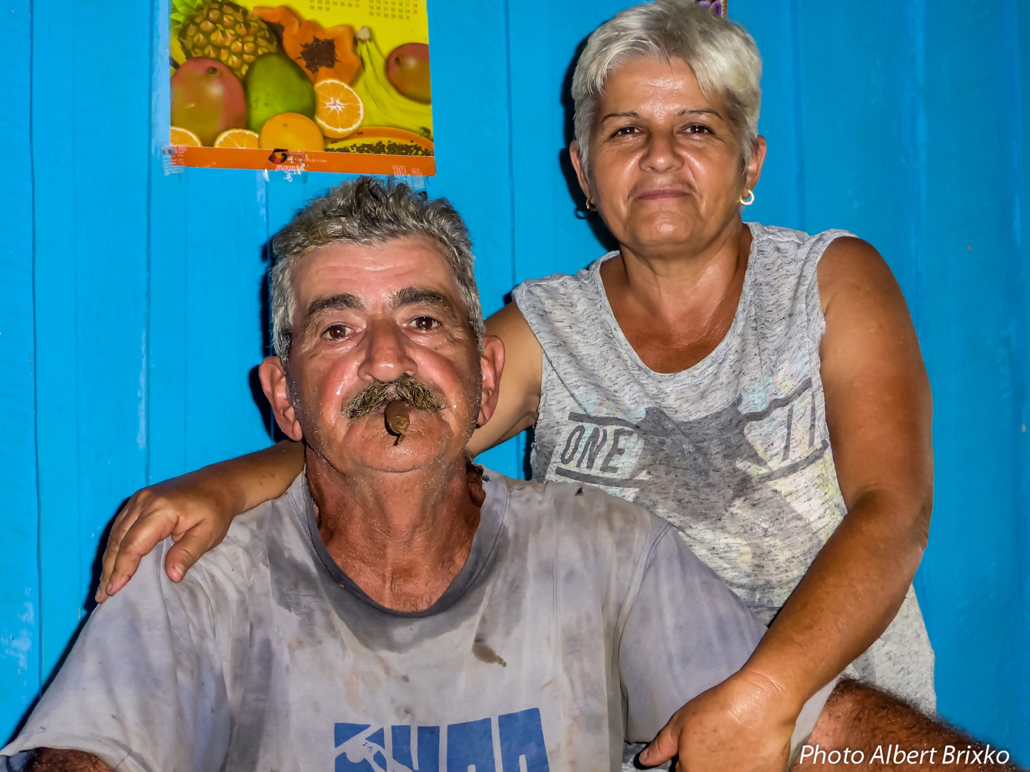 Nous progressons parmi les diverses plantations lorsque nous sommes abordés par un paysan, un « guajiro » comme on les nomme ici… Quelle gentillesse, quelle rencontre « authentique » pour nous ! Ce fermier va nous consacrer plus d’une heure à nous expliquer ses différentes cultures : le tabac, bien sûr, mais aussi le manioc , le riz, la canne à sucre, le haricot et le fameux café cubain. Il nous invite à le suivre dans sa (modeste) demeure … où, avec son épouse, nous dégusterons le café de sa production : un moment inoubliable pour nous ! Il nous montrera aussi la confection d’un cigare qu’il allumera aussitôt. Avec son autorisation, nous prenons quelques photos que nous promettons de leur envoyer. Espérons qu’elles soient parvenues à destination ! (ndlr : mieux vaut tard que jamais… Nos cartes postales, expédiées de Cuba le 15 décembre sont arrivées à leurs destinataires belges, quasi 2 mois plus tard…). Pour remercier nos hôtes, nous leur offrons un « bic » et quelques bonbons que la maîtresse de maison s’empressera d’emmener comme s’il s’agissait de petits trésors…