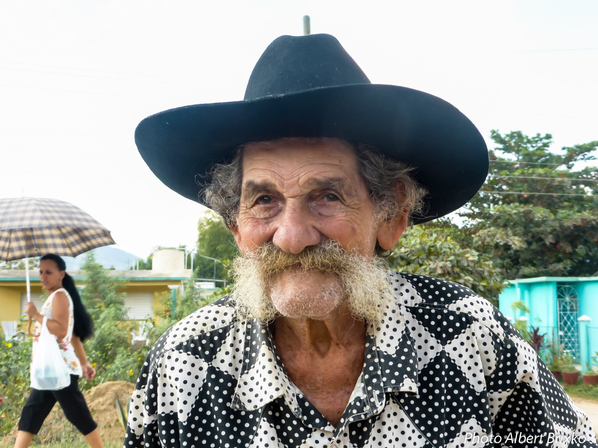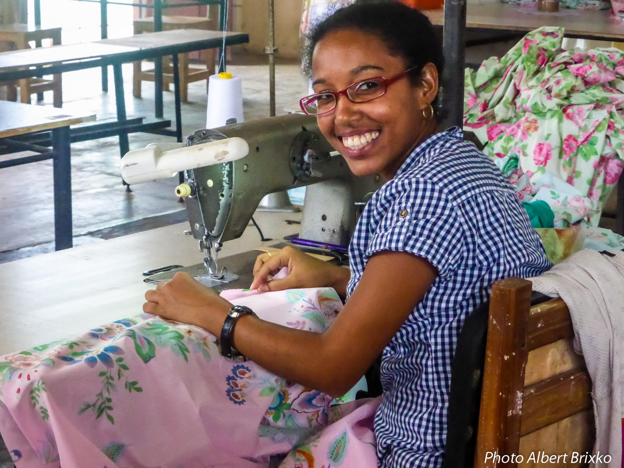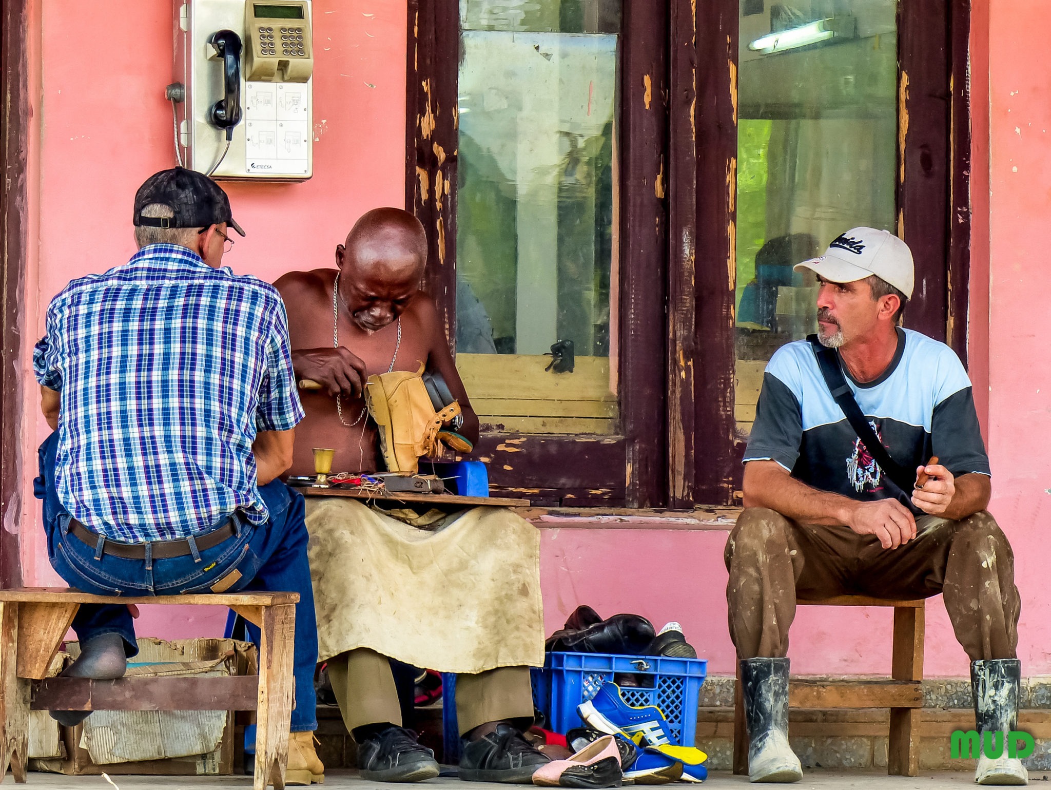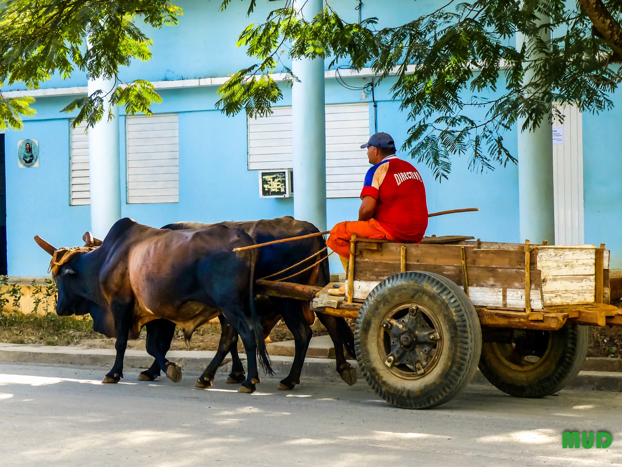 Nous flânons un peu ici, bien assis sur nos robustes chaises car… le spectacle est partout et… permanent ! Juste en face de nous, de l’autre côté de la rue, deux artisans travaillent… L’un d’eux est cordonnier et s’affaire à réparer la chaussure d’un monsieur qui attend, partiellement déchaussé… Dans la rue, c’est un incessant défilé de charrettes tirées par des chevaux, des bœufs ou des buffles; parfois passe un vieux camion russe chargé de feuilles de palmiers. N’oublions pas les « Oldtimers », ces vieilles voitures américaines qui, ici comme partout ailleurs à Cuba, égaient agréablement les rues. Seules s’en distinguent les Lada de la police, seules voitures non customisées ! Sur les trottoirs, quelques jolies étudiantes, toutes pimpantes dans leurs uniformes impeccables…